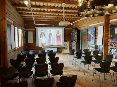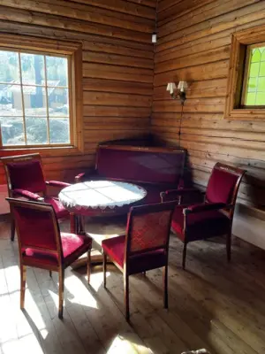 - Finstue med sittegrupper i eldre stil og et langbord