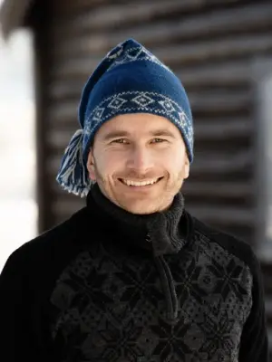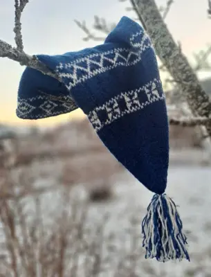Strikk en 1800-talls mannslue fra Horgeseter i Sigdal, etter original i Sigdal Museums samling.