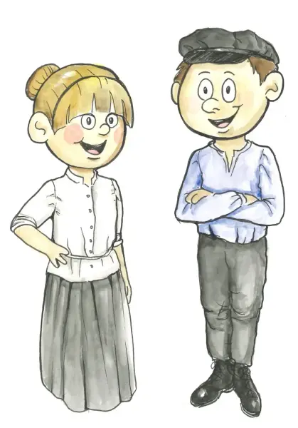 Idun and Isak are drawn by Martine Solstad Larsen (Historisk Kunst og Håndverk).