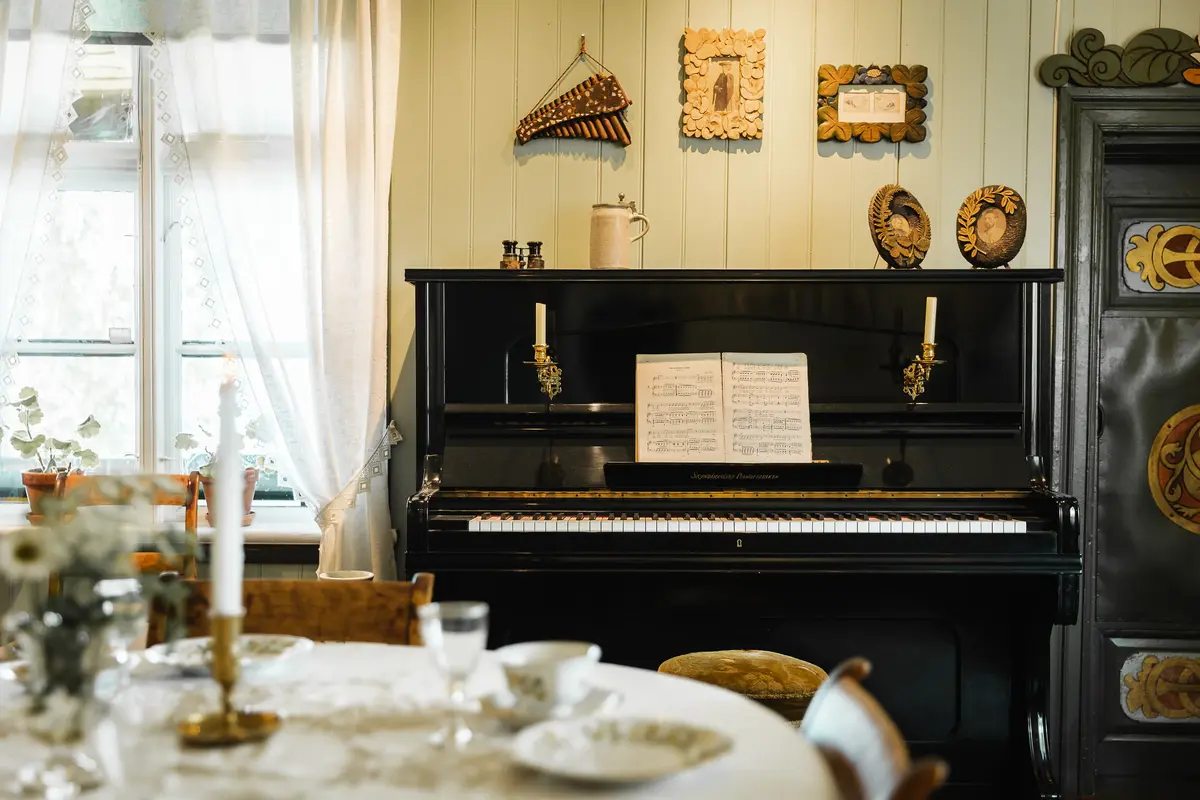 Bilde viser peisestua på Lauvlia. Ved å dra pilen frem og tilbake kan du se hvordan peisestua ser ut i dag og hvordan den så ut da Kittelsen og familien bodde der. Det er Theodor og Inga som sitter ved peisen.