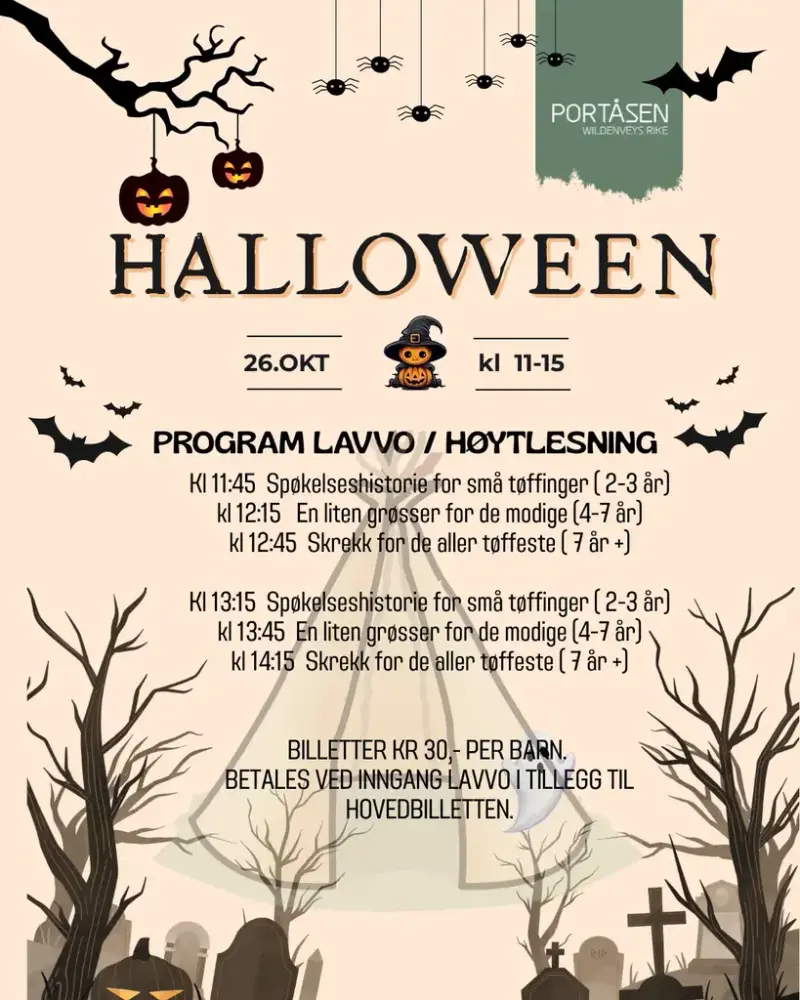 Søndag 26. oktober inviterer vi alle barn til Halloween på Portåsen! Vi forvandler låven til et spøkelseshus og oppfordrer alle som ønsker til å komme utkledd