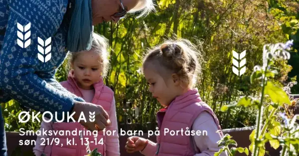 Smaksvandring for barn i kjøkkenhagen på Portåsen. En sanselig oppdagelsesferd med fokus på smak, lukt og kunnskap.