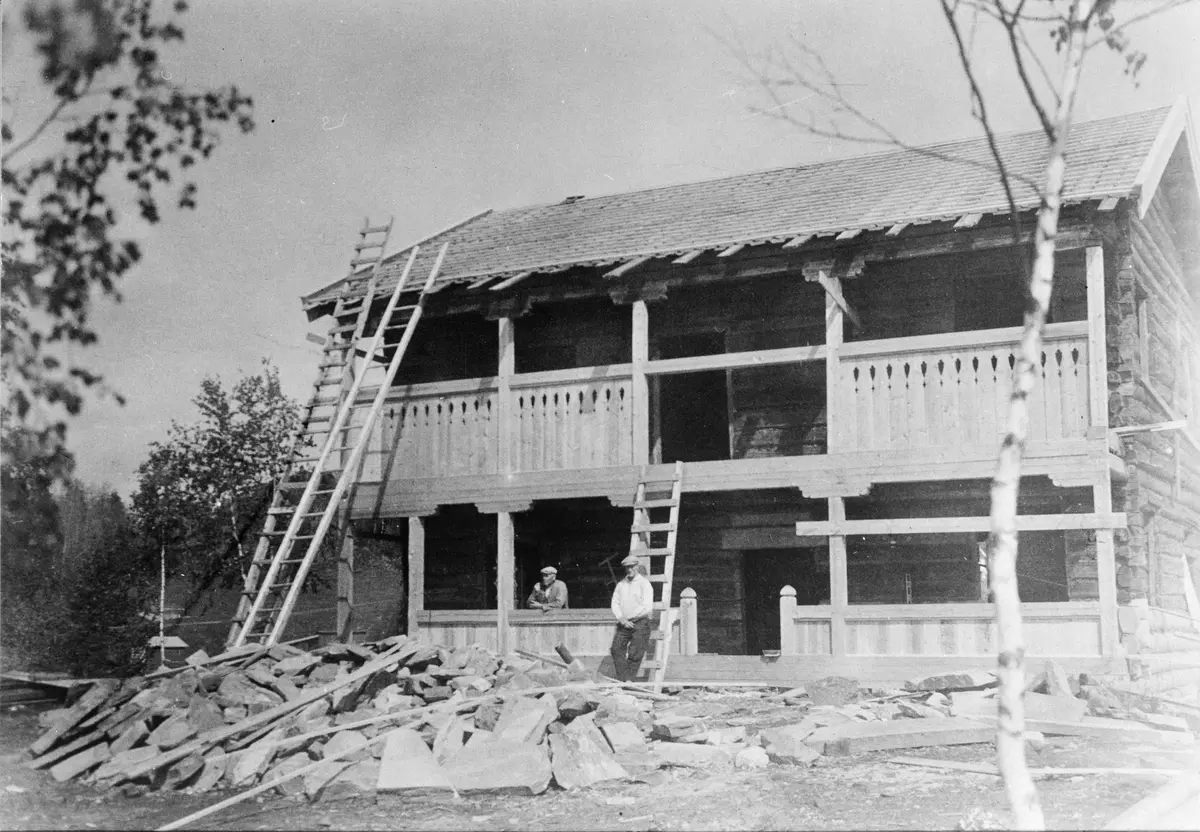 The building from Eikje under construction at Sigdal Museum, 1940s