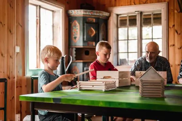 In Berganstua at the museum area, we have a timber building station which is open during the museum's opening hours. Here you can let your imagination run wild and build yourself a castle in timber if you wish. Or perhaps a copy of the Eikje building?