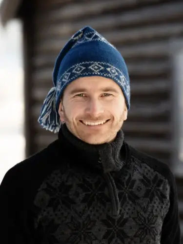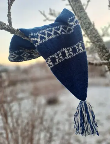 Strikk en 1800-talls mannslue fra Horgeseter i Sigdal, etter original i Sigdal Museum.