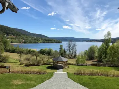 Nyt nytrukket te fra gammelt porselen med ferske fingersandwicher, nystekte scones, syltetøy og kaker i Villa Fridheims gamle stuer i første etasje med utgang til hagen og utsikt mot Krøderfjorden.